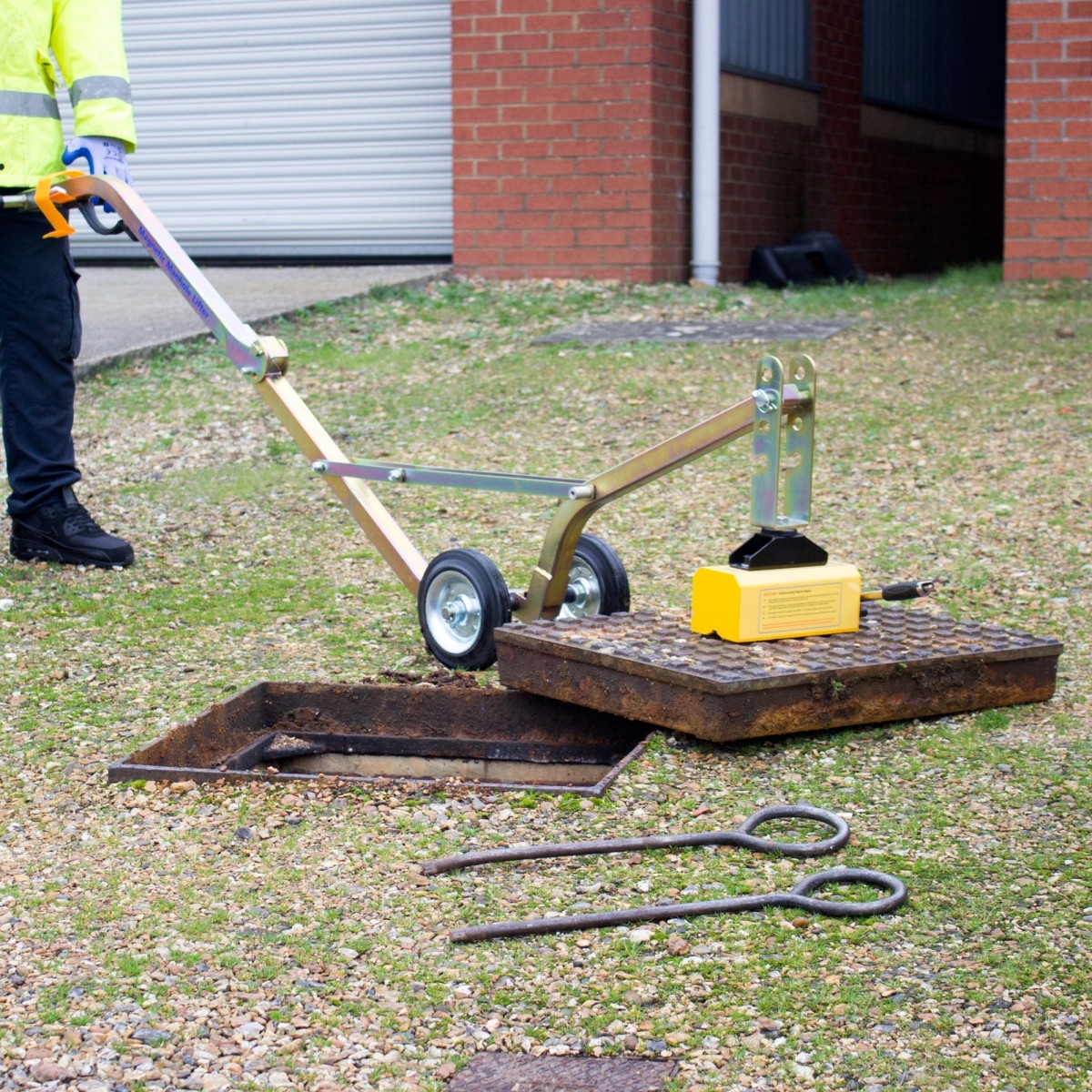 Manhole Buddy起渠蓋機本質上比大多數井蓋升降系統更安全。 首先,當使用蓋子提升小車時,操作員站在距離凸起的井蓋和開放室一米多的地方。 其次,通過向下推動提升小車手柄來實現提升井蓋; 這種行為導致起吊或扭傷的風險最小。 由於輪式推車類似於槓桿系統,因此僅需要操作員的適度物理輸入來提升典型的50至60kg的檢修孔或排水蓋。